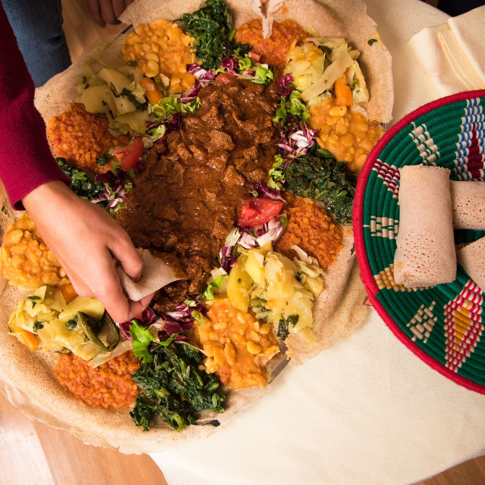 The centrepiece of most meals at Warsà is the injera, a spongy sourdough flatbread made from teff flour that serves as both the base for the meal and the utensil used to scoop up the stews and dishes. Meals are typically served on large communal platters, encouraging diners to share and experience a variety of flavours.